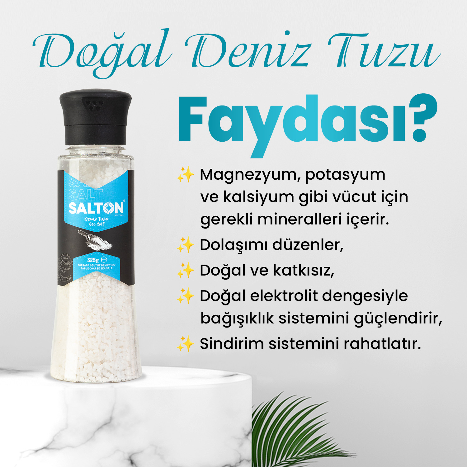 ♦ Deniz tuzu, insan sağğı için büyük önem taşıyan sodyum, potasyum, kalsiyum, magnezyum, brom, klor, demir, florür ve sülfür gibi mineraller başta olmak üzere seksenden fazla mineral içermektedir.